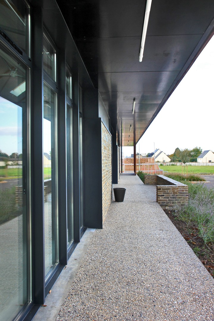 L’entrée principale est facilement identifiable par un traitement en creux, créant ainsi un auvent et un appel visuel depuis le parking et le bourg.