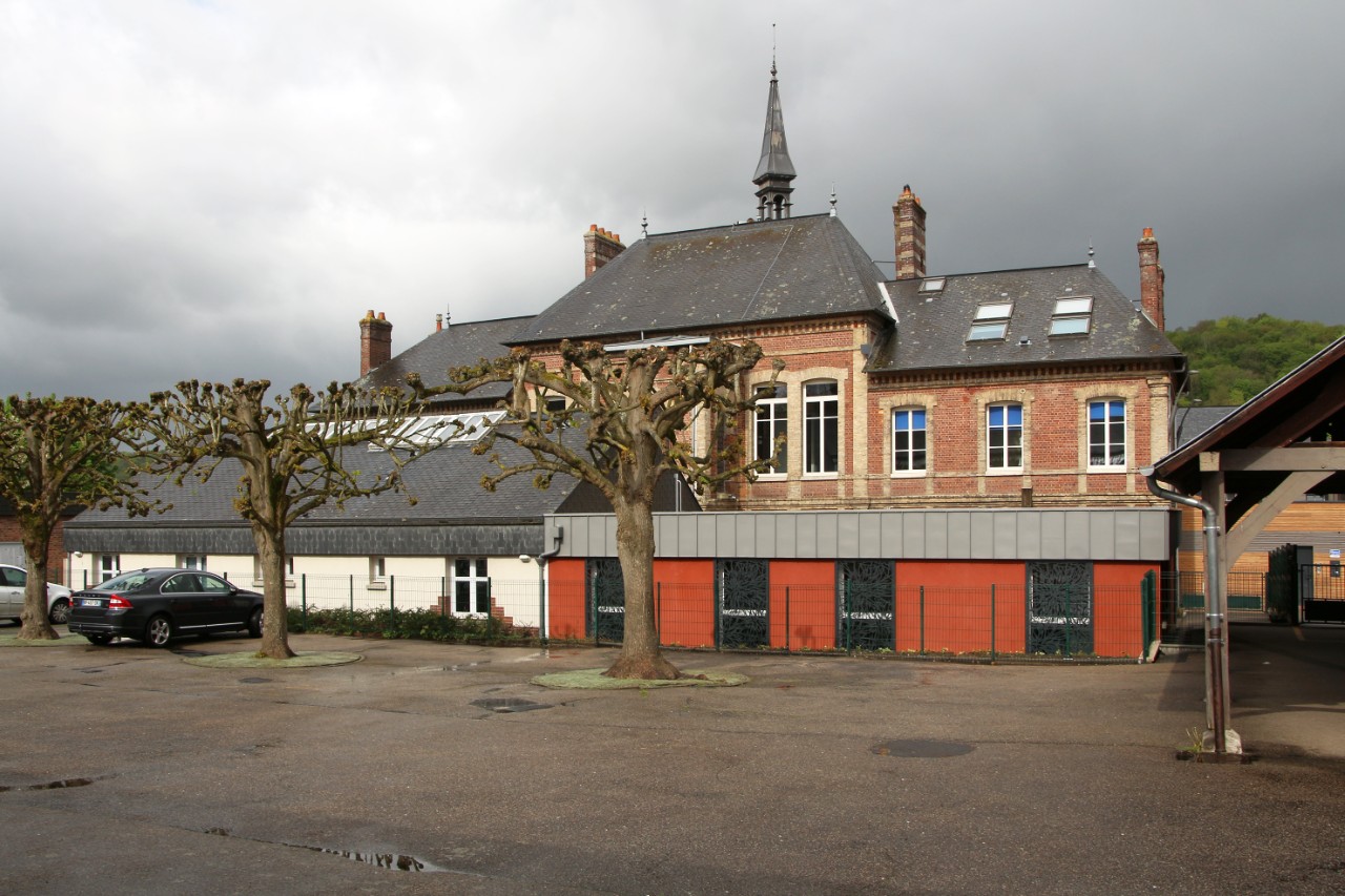 Réalisée en simple RDC en toiture terrasse de manière à laisser une vue dégagée aux étages de la Mairie contigüe, l'extension voit ses fenêtres revêtues de volet en tôle découpée au jet d'eau afin de protéger des chocs de ballons de la cour d'école. Le motif réalisée sur mesure est un dessin de notre invention réinterprétant la fleur de Montville de manière graphique.