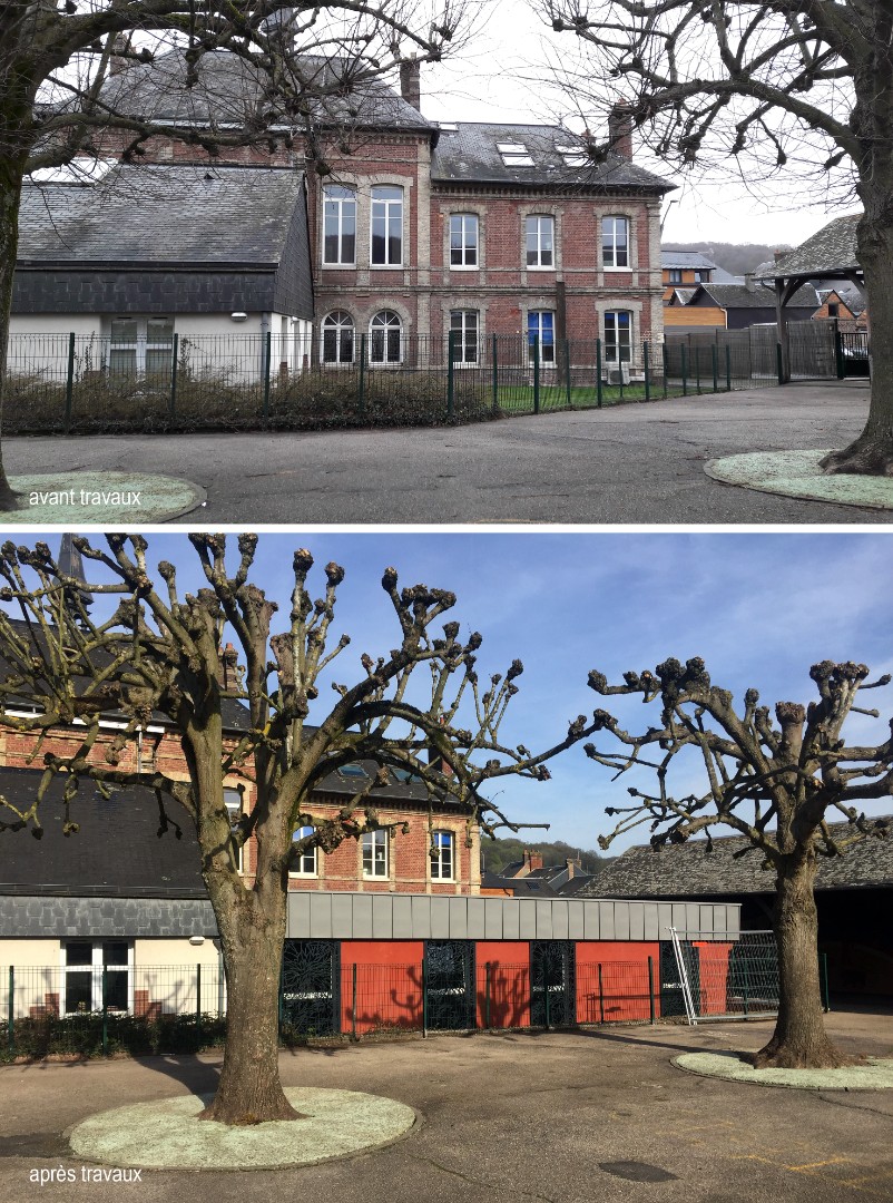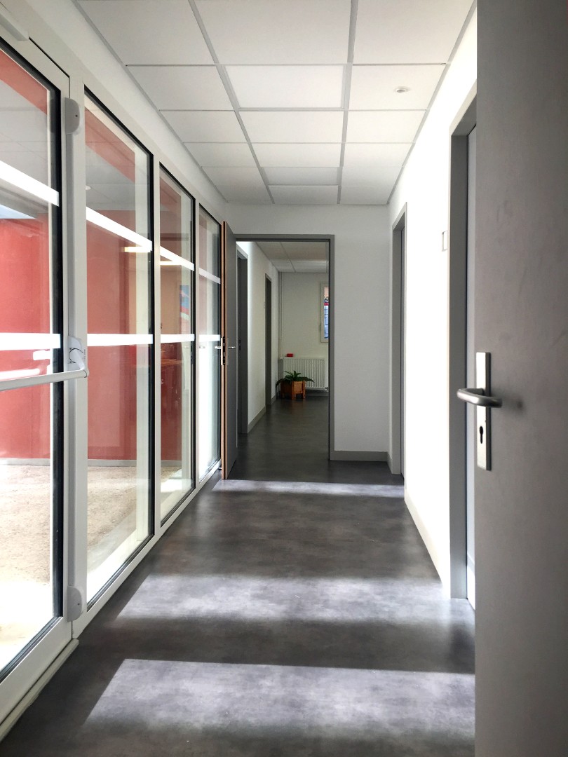 - D’abord la construction d’une seconde extension de 98 m² à l’arrière de la mairie, prise sur la surface d’une petite cour disponible ainsi que sur quelques m² de la cour de récréation de l’école élémentaire Chevalier. Cet agrandissement permet l’accueil du public au sein du service Animation et Vie locale qui assure notamment la billetterie des spectacles, la gestion des inscriptions à l’école de danse, à la cantine, aux garderies scolaires et à l’accueil de loisirs. Ce service était auparavant au 1er étage de la mairie. Dans cette extension, il y a deux autres pièces : un local reprographie et un bureau à usage partagé, utilisé notamment par la Mission locale, le CLIC et l’assistant de prévention de la commune.